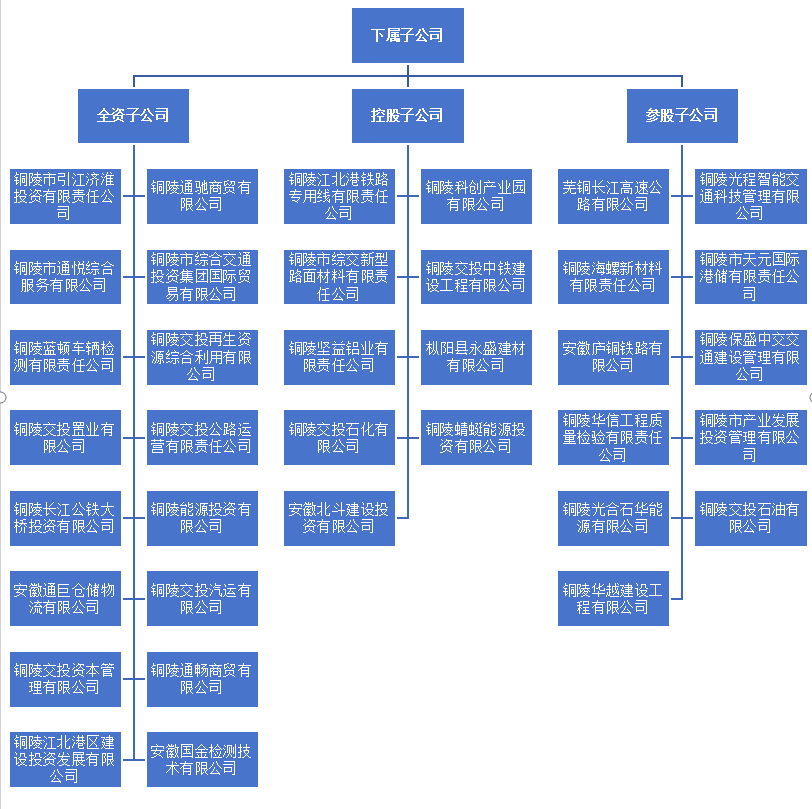 2017年8月18日,市委、市政府立足一江兩岸發(fā)展新局面,決定在原市交投公司整體劃轉(zhuǎn)新體基礎上組建集全市交通基礎設施項目投融資、開發(fā)建設和運營管理、參與項目謀劃工作為一體的綜合交通投資集團有限公司。注冊資本金109.77億元人民幣,企業(yè)主體信用評級“AA”等級,擁有全資子公司18家,控股公司10家,參股公司11家,是由銅陵市人民政府出資的市屬國有企業(yè)。