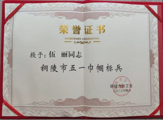4月27日上午,銅陵市總工會舉辦的2023年銅陵市“五一”先進女職工集體和個人表彰大會順利召開。伍麗同志憑借著對工作的熱忱、堅守和專業(yè)素養(yǎng),榮獲“五一巾幗標兵”稱號。