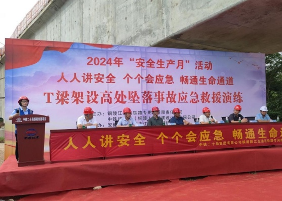 6月25日下午,江北港鐵路專用線有限責任公司聯合中鐵建長江(銅陵)港鐵建設運營有限公司,在江北港鐵路專用線項目黃泥河特大橋68#墩附近舉辦T梁架設高處墜落事故應急演練。本次演練由江北港鐵路專用線公司董事長、總經理張葉來擔任總指揮,中鐵二十局項目經理部安全總監鐘健任現場指揮,廬江縣應急管理局總工程師顧德祥、廬江縣發改委總工程師朱雷、泥河鎮人民政府黨委副書記高磊受邀蒞臨現場指導點評。江北港鐵路專用線公司安全質量部、工程管理部,上海先行項目監理部,中鐵十六局、中鐵二十局項目經理部相關人員參加活動。