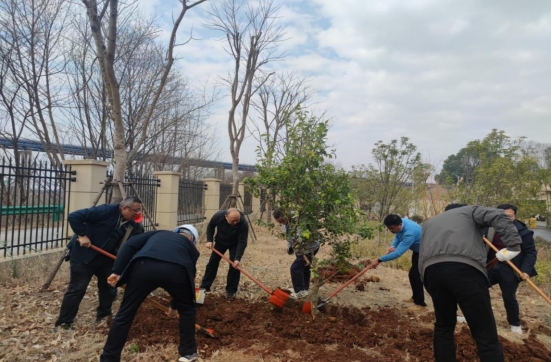 活動現場,處處洋溢著熱火朝天的勞動景象,黨員干部帶頭揮鍬鏟土,大家分組協作,挖坑、施肥、栽苗、培土、踩實、澆水井然有序,分別種植了桂花樹、柿子樹、橘子樹、桃樹、月季、映山紅等花卉樹木140余株,大力營造“三季有花、四季常綠”的生態景觀。