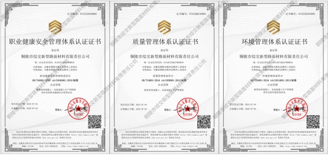 近日,綜交新型路面材料公司順利取得ISO“三體系”(ISO9001質(zhì)量管理體系、ISO14001環(huán)境管理體系、ISO45001職業(yè)健康安全管理體系)認(rèn)證證書,這是我司在提升企業(yè)綜合實(shí)力過程中取得的新進(jìn)展,標(biāo)志著我司在精細(xì)化、制度化、規(guī)范化管理方面邁上了新臺階。