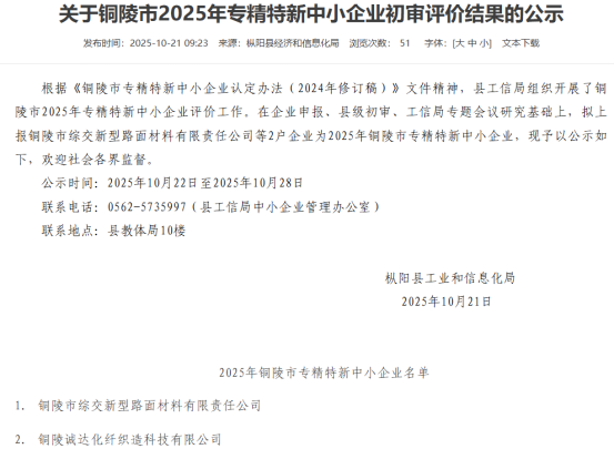 近日,樅陽縣工業(yè)和信息化局正式發(fā)布《關(guān)于銅陵市 2025年專精特新中小企業(yè)初審評價結(jié)果的公示》,綜交新型路面材料公司憑借在專業(yè)領(lǐng)域的技術(shù)積淀、創(chuàng)新能力及市場競爭力,歷經(jīng)企業(yè)自主申報、縣級部門初審、工信局專題會議研究等多環(huán)節(jié)嚴謹審核,成功入選初審名單,擬認定為2025年銅陵市專精特新中小企業(yè)。