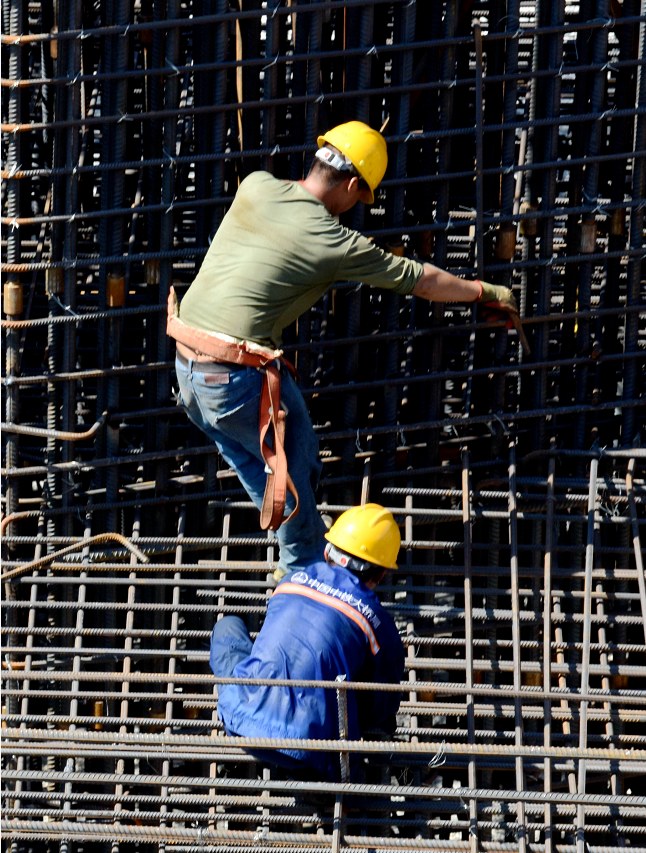 焊花飛舞、機(jī)器轟鳴,上午6時(shí)不到,鋼筋綁扎工劉友勇就和工友穿梭在“鋼筋森林”中。在下游側(cè)承臺(tái)9米多高的作業(yè)平臺(tái)上,劉友勇像蜘蛛人一樣緊貼著剛捆扎好的“樹(shù)干”,正在綁扎南主墩塔座鋼筋。承臺(tái)上沒(méi)有任何遮擋,劉友勇和工友們完全暴露在烈日下。雖然天氣很熱,但幾乎所有鋼筋工都戴著厚厚的手套,不少人的手套甚至還磨破了。“現(xiàn)在這時(shí)候,鋼筋表面溫度有六七十?dāng)z氏度。不戴手套拿不了鋼筋,很燙的。”劉友勇一邊笑著,一邊抓住滾燙的鋼筋,嚴(yán)格按照?qǐng)D紙尺寸和間距,一根一根地將鋼筋綁扎固定起來(lái)。由于長(zhǎng)時(shí)間觸摸滾燙的鋼筋,他的手套一直處于被汗水濕透的狀態(tài)。