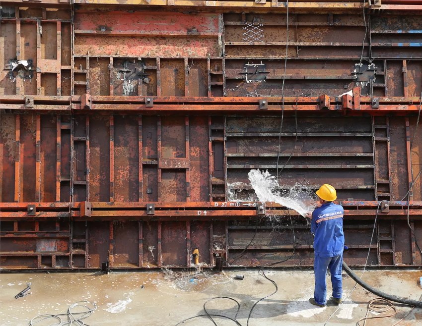 入夏后,持續(xù)的高溫天氣為現(xiàn)場(chǎng)施工帶來(lái)了諸多不利影響,為了控制混凝土的出廠溫度,項(xiàng)目部在混凝土攪拌過(guò)程中加入冰塊,同時(shí)對(duì)混凝土罐車進(jìn)行灑水冷卻,確?;炷吝\(yùn)送到現(xiàn)場(chǎng)泵入模板時(shí)溫度低于30度,確?;炷临|(zhì)量。此外,經(jīng)過(guò)太陽(yáng)長(zhǎng)時(shí)間的照射,現(xiàn)場(chǎng)鋼模板內(nèi)部溫度往往會(huì)比氣溫高上許多,為降低混凝土芯部溫度,項(xiàng)目部在澆筑過(guò)程中,持續(xù)對(duì)外模板灑水降溫,同時(shí)在塔座及塔柱內(nèi)部設(shè)置了循環(huán)冷卻水管,一直循環(huán)至芯部溫度冷卻至安全水平,有效控制了混凝土內(nèi)外溫差,避免出現(xiàn)混凝土表面裂紋。