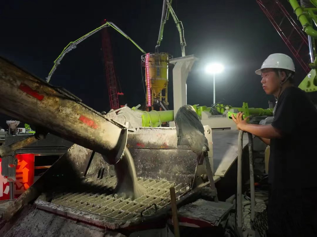 3號墩技術負責人潘萌介紹,根據3號墩圍堰結構特點、封底混凝土的數量及混凝土的生產運輸能力,整個鋼圍堰分成7個隔艙進行封底,單艙封底混凝土最大達4033.0立方米。根據施工方案要求,按照從低處到高處的原則對圍堰各個隔艙進行封底。“此次施工采用中央集料斗拔球,多導管布置、從低角落向對側逐步推進的水下混凝土封底工藝。”潘萌介紹,現場施工時,將中央集料斗臨時固定在相應位置,采用多臺汽車泵向中央集料斗集中供料,待集料斗中混凝土滿足首灌要求后,進行首灌“拔球”,其余導管采用“插管法”施工,不斷循環往復,直至封底完成。