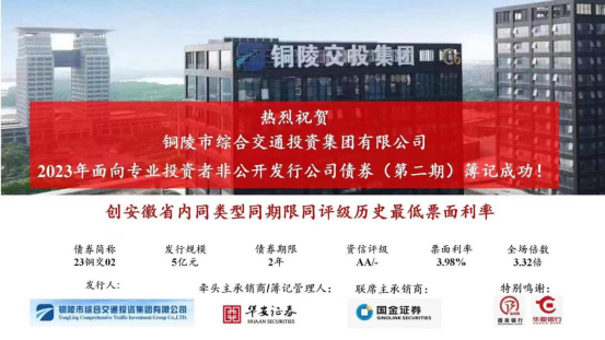 在監管環境愈加趨嚴、資本市場政策嚴格收緊的形式下,集團公司周密部署、充分把握發行政策,10月26日,市交投集團成功發行2023年度第二期非公開公司債,規模5億元,期限2年,票面利率3.98%,主承銷商華安證券,聯席主承銷商國金證券。