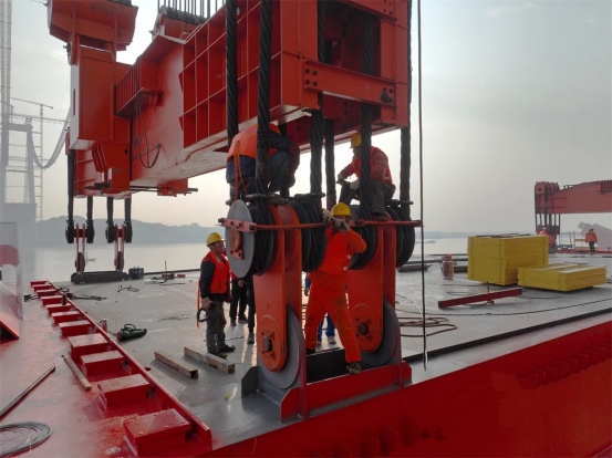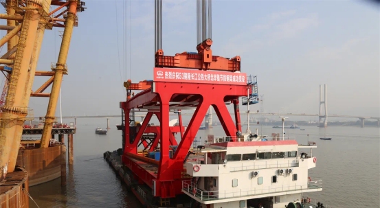 世界首座雙層斜拉-懸索協作體系大橋,主跨988米。主橋鋼梁采用直桁斷面和三角桁布置形式,分為斜拉區段、懸吊區段、斜拉懸吊交叉區段三部分。鋼梁受力體系不同,剛度差異大,線型控制及合龍難度大。全橋鋼梁共計6.66萬噸,分為59個節段,最大節段重量約1600噸。此次架設的鋼梁是邊跨Z0-Z1節段,長14米,桁寬35米、桁高13.5米,重達1230噸。
