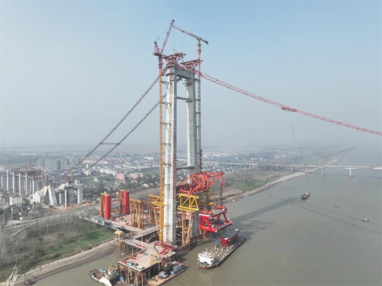11月23日,G3銅陵長江公鐵大橋北主塔成功架設第一節鋼梁,拉開了大橋江北側鋼梁架設的序幕。
