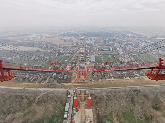在長(zhǎng)江水域之上,G3大橋南北主塔遙遙相望,由貓道和一根根纜索構(gòu)成的“紅色長(zhǎng)龍”將南北兩岸緊緊相連,跨江大橋雄姿初現(xiàn),預(yù)計(jì)2024年2月初完成主纜架設(shè)。