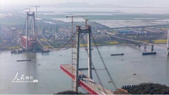 2024年3月22日,在安徽G3銅陵長江公鐵大橋施工現場,施工人員在進行主跨鋼梁施工作業。目前,大橋進入主跨鋼梁施工階段,預計今年7月完成大橋合龍。大橋全長11.88公里,主跨988米,項目建成后將具有高速公路、城際鐵路、貨運鐵路3種過江功能,對完善區域綜合立體交通網具有重要意義。