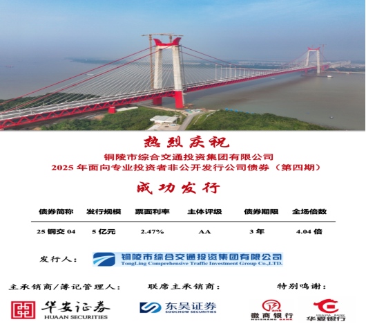 9月15日,市交投集團成功簿記發行2025年第四期面向專業投資者非公開公司債券,額度5億元,期限3年,票面利率2.47%,全場認購倍數4.04倍。債券票面利率較1年期貸款市場報價利率(LPR)3.0%下降53個BP,綜合節約融資成本約795萬元。