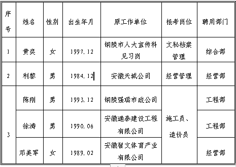 根據《銅陵市綜合投資集團有限公司(華越建設工程公司)公告》,現將相關崗位擬聘用人員名單公示如下: