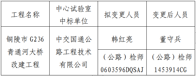 銅陵市G236青通河大橋改建工程中心試驗室,于2019年9月29日開標(biāo),中標(biāo)單位為中交國通公路工程技術(shù)有限公司。因原中標(biāo)項目負(fù)責(zé)人個人家庭原因,無法到崗履行合同責(zé)任與義務(wù),故中交國通公路工程技術(shù)有限公司申請中心試驗室項目負(fù)責(zé)人變更。現(xiàn)將項目負(fù)責(zé)人變更情況予以公示,如有異議,請于7日內(nèi)向銅陵市綜合交通投資集團有限公司反映。