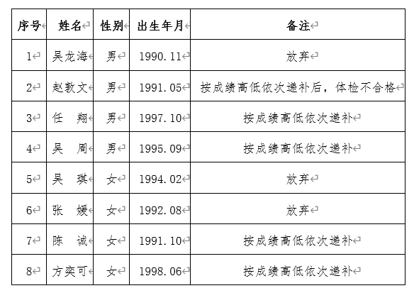 因出現(xiàn)部分考生自愿放棄情況,我公司對(duì)入圍體檢人員按照成績排名依次進(jìn)行遞補(bǔ)。現(xiàn)將交投集團(tuán)司屬公司銅陵市江北公路管理有限責(zé)任公司收費(fèi)員、監(jiān)控員崗位招聘遞補(bǔ)入圍體檢人員名單公告如下: