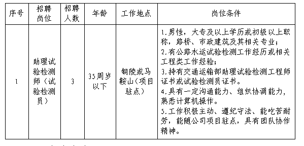 銅陵市綜合交通投資集團有限公司司屬全資子公司銅陵市華信工程質量檢驗有限責任公司因經營發展需要,現面向社會公開招聘若干名工作人員,現將具體事項公告如下: