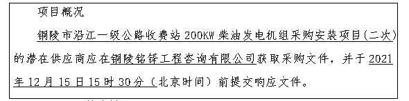 項(xiàng)目名稱(chēng):銅陵市沿江一級(jí)公路收費(fèi)站200KW柴油發(fā)電機(jī)組采購(gòu)安裝項(xiàng)目(二次)