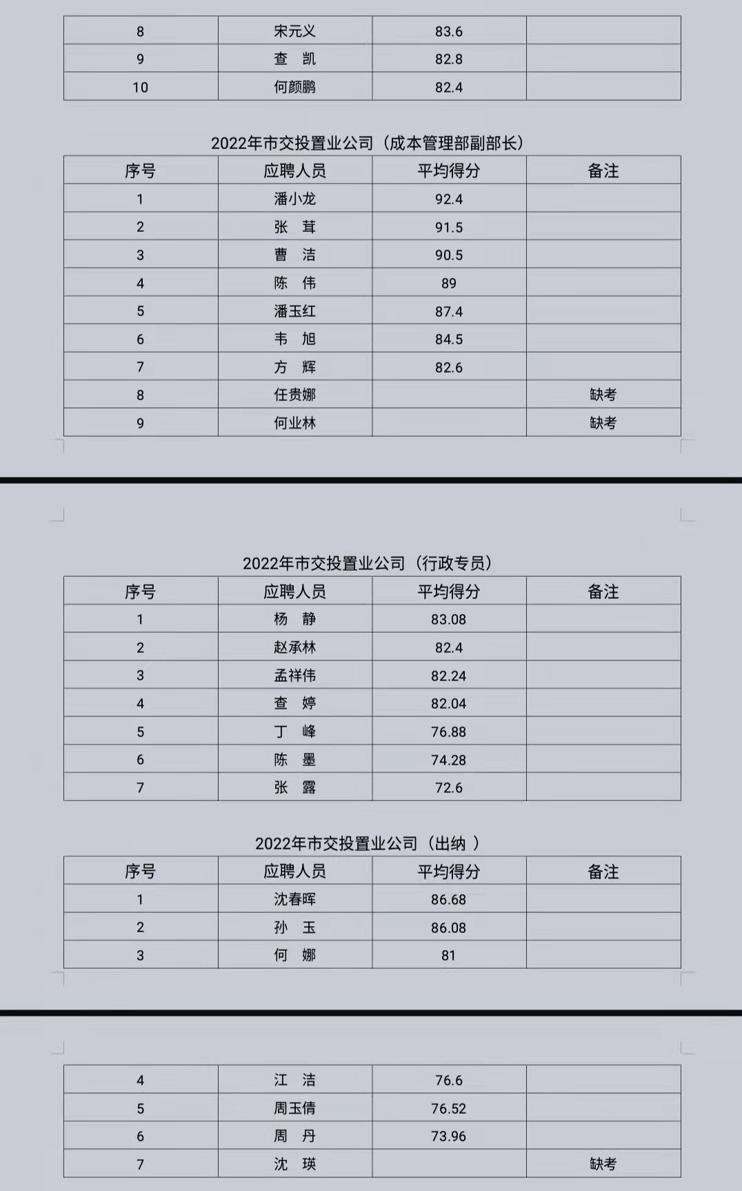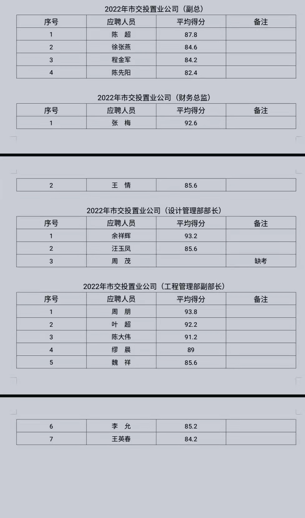 各位考生: 根據《銅陵交投置業有限公司公開招聘人員公告》,我公司已于2022年2月17日開展市交投置業公司副總、財務總監、設計管理部部長、工程管理部副部長、成本管理部副部長、行政專員、出納崗位的面試工作,現將報名參與人員面試成績公示如下: