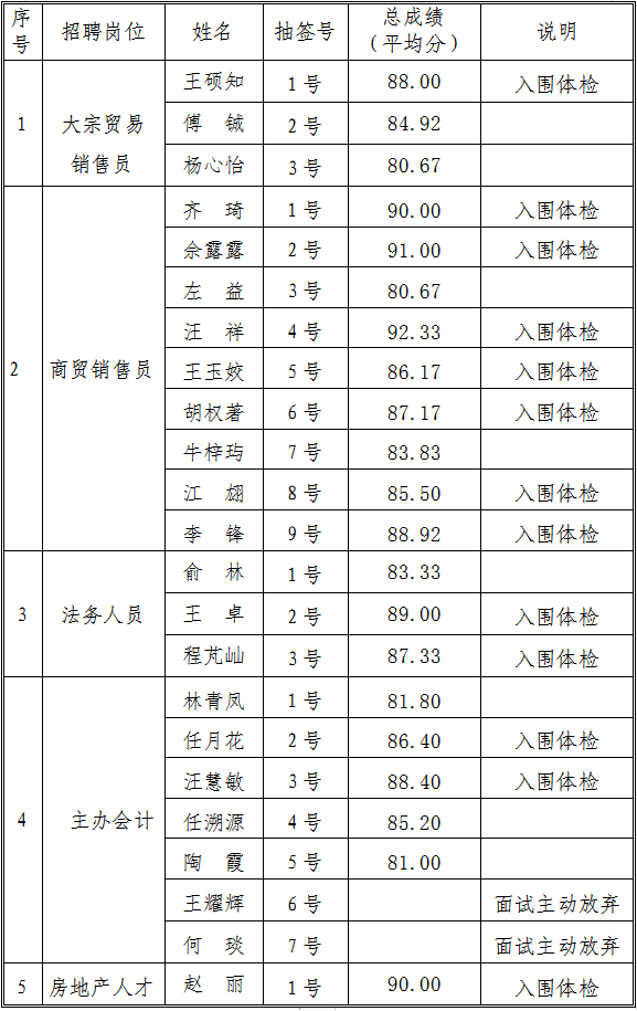 因公司經營業務發展需要,根據應聘者現場面試綜合能力表現情況,結合公司儲備人才需求,經集團公司黨工委會議研究決定,現將交投集團公司商貿銷售員等崗位招聘情況公示如下: