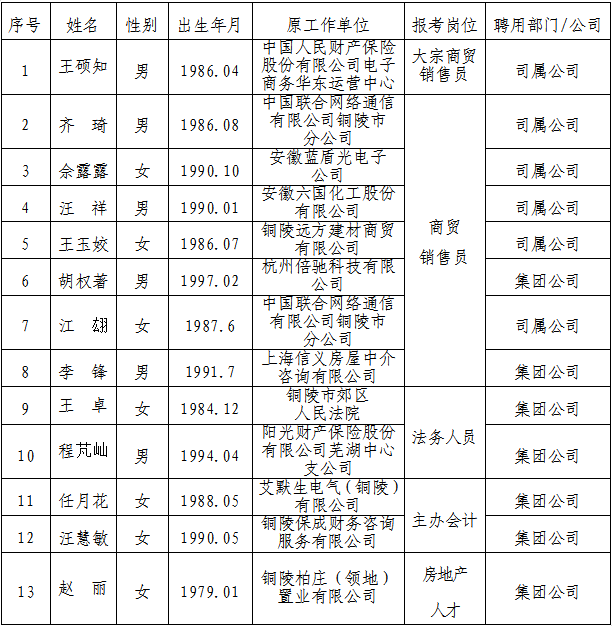 根據《銅陵市綜合交通投資集團有限公司招聘人員公告》,現將相關崗位擬聘用人員名單公示如下: