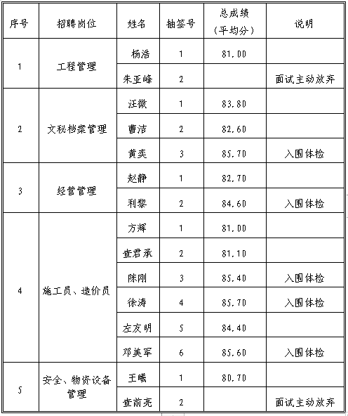 根據應聘者現場面試綜合能力表現情況,結合公司儲備人才需求,經公司研究決定,現將招聘情況公示如下: