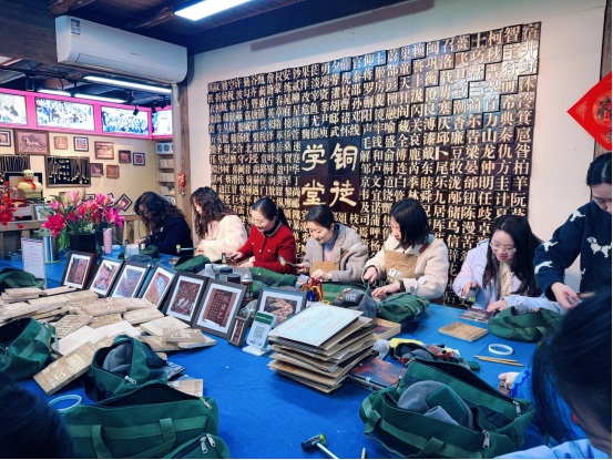上午大家統(tǒng)一乘車出發(fā),一路歡聲笑語(yǔ)抵達(dá)犁橋水鎮(zhèn)。在銅徒學(xué)堂手工體驗(yàn)區(qū),一場(chǎng)充滿文化底蘊(yùn)的非遺銅拓DIY正式開(kāi)啟。專業(yè)老師現(xiàn)場(chǎng)講解銅拓文化、演示工具使用與制作步驟,女職工們認(rèn)真聆聽(tīng)、細(xì)心實(shí)操,在輕薄銅箔上拓印吉祥紋樣,指尖流轉(zhuǎn)間完成一件件兼具紀(jì)念意義與文化內(nèi)涵的作品,現(xiàn)場(chǎng)氛圍溫馨而專注。作品制作完成后,大家手持成品合影留念,用匠心定格節(jié)日美好。