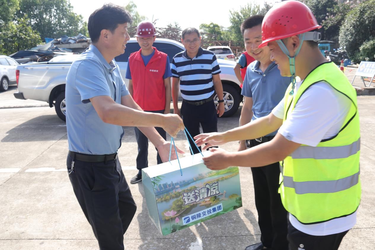 在G3銅陵長江公鐵大橋先行工程項目部、江北港鐵路專用線項目部、綜交新型路面材料施工現場,章新華、黃勇為一線員工送去了防暑降溫物品,并叮囑項目建設人員要切實做好安全防護工作,始終樹牢安全觀,堅持文明施工,確保全面安全穩定。