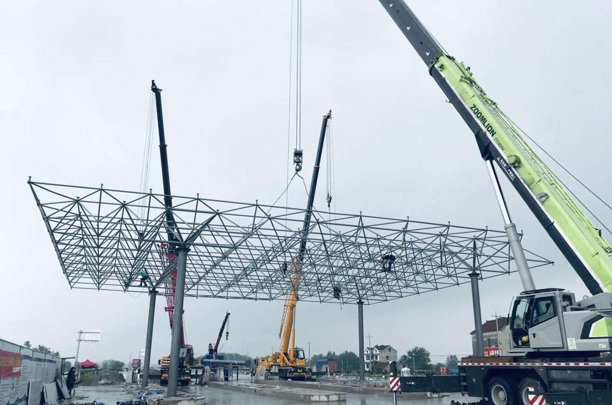 7月12日,G347湯溝收費區完成收費大棚半幅網架吊裝,預計7月底完成全部收費大棚網架吊裝。